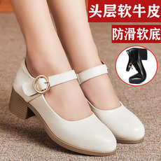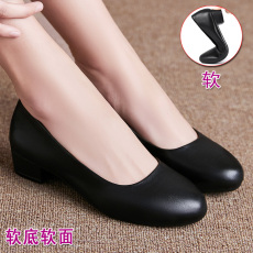 真皮工作鞋女黑色单鞋中跟粗跟皮鞋久站不累脚软底上班职业女鞋子