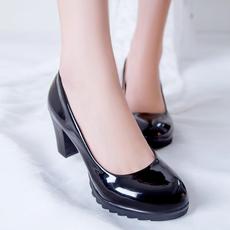 2025春季新款粗跟单鞋女圆头亮光中跟工作鞋通勤黑色高跟工作鞋子