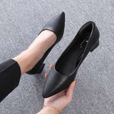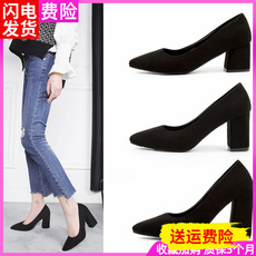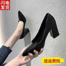 2026韩版粗跟浅口高跟单鞋女尖头职业工作鞋黑色中跟皮鞋上班鞋子