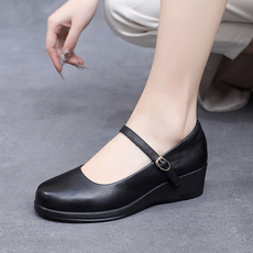 女皮鞋妈妈鞋软底中跟单鞋秋季舒适坡跟黑色牛筋底工作瓢鞋子百搭