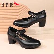 红蜻蜓真皮女士皮鞋新款春秋黑色米色中跟方跟工作鞋子职业正装软