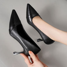 真皮单鞋女2025新款夏季黑色工作尖头高跟鞋子细跟中跟单鞋上班鞋