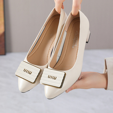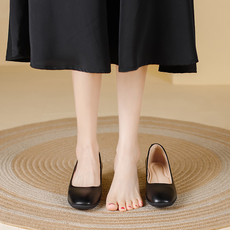 真皮粗跟百搭浅口单鞋女2025新款中跟尖头软皮工作鞋子女黑色皮鞋