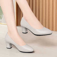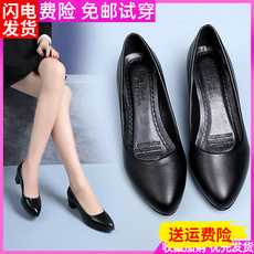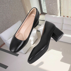 真皮浅口粗跟单鞋女舒适中跟工作鞋子黑色小皮鞋春夏季大码妈妈鞋