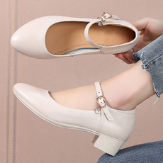 新款真皮粗跟皮鞋中跟一字扣跳舞软底单鞋不累脚女鞋子黑色工作鞋