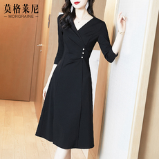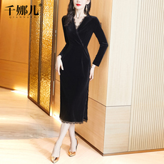 小众设计不规则黑色丝绒连衣裙秋季高冷御姐风V领修身显瘦裙子女