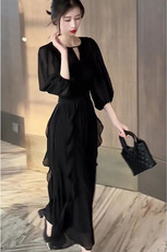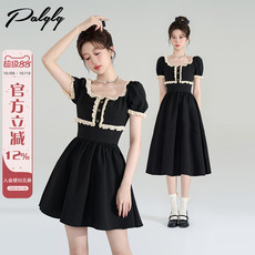 法式泡泡袖黑色连衣裙女薄款赫本风小黑裙收腰显瘦a字裙夏款遮肉