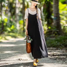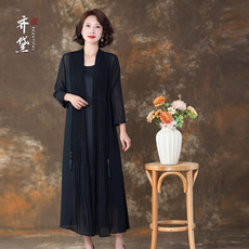 兮风改良国风连衣裙黑色提花复古休闲宽松垂感显瘦显高加长裙夏季