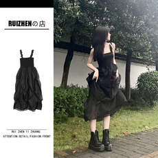 诗绪黑色气质网纱连衣裙女夏季中长款2025新款显瘦流行裙子
