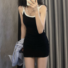 辣妹黑色吊带连衣裙女装夏季2023新款性感露背撞色无袖收腰包臀裙