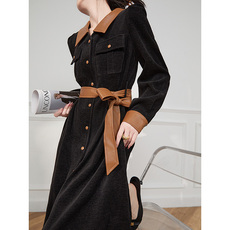 2025新款黑色长袖连衣裙女秋季半高领拼接竖条纹裙摆时尚A字裙子