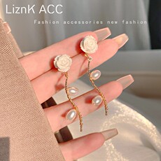 超仙长款山茶花仿珍珠耳环2022年新款潮小众设计感高级耳钉女