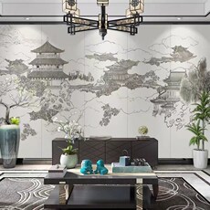 3d立体新中式建筑祥云壁纸沙发背景墙纸酒店主卧装修饭店硬包墙布