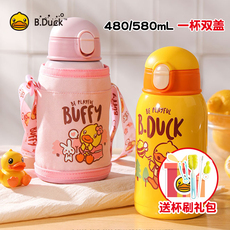 B.Duck小黄鸭儿童吸管保温水杯两用不锈钢600ml幼儿园背带大水壶