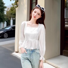 zk lin法式清新百搭泡泡袖白色方领女收腰显瘦短款温柔风洋气小衫