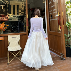 秋冬纯色百搭高腰显瘦a字大摆纱木耳边拼接网纱仙女裙长款半身裙