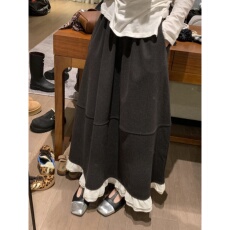 深灰色蕾丝拼接毛呢半身裙长款女秋冬a字大码胖mm设计感花边伞裙