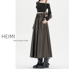 咖色PU皮半身裙女秋冬季复古松紧腰A字系带皮裙高级感大摆百褶裙