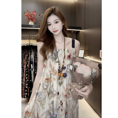 轻奢宽松吊带中长款裙子印花2025女新款夏季大码A字裙时尚连衣裙