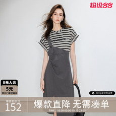 德玛纳假两件拼接条纹连衣裙女25夏季新款字母印花开叉A字中长裙