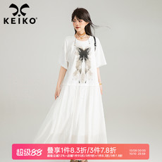KEIKO气质拼接薄纱摆白色中长款连衣裙夏季简约气质蝴蝶印花A字裙