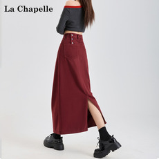 拉夏贝尔安可拉红牛仔半身裙女秋季高腰后开叉休闲a字包臀长裙子M