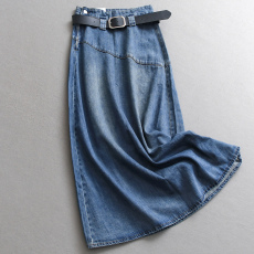 紫涵复古牛仔蓝半身裙女夏季新款休闲高腰显瘦下摆毛边A字中长裙