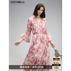 COCOBELLA度假风印花雪纺连衣裙女26春V领浪漫大摆长裙FR3210