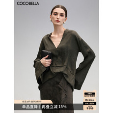 COCOBELLA新中式立体压褶缎面衬衫女V领国风气质喇叭袖上衣SR3072