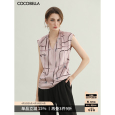 COCOBELLA樱花粉定位印花缎面无袖衬衫女春夏V领捏褶上衣SR3102-3