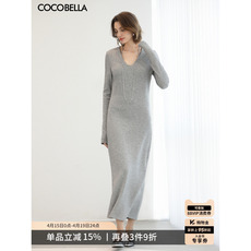 COCOBELLA气质V领灰色长袖休闲连衣裙女通勤亮葱针织长裙FR3242-3