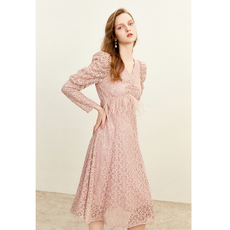 MISSCOCOON轻奢羽毛蕾丝连衣裙复古抽褶泡泡袖V领长裙秋款