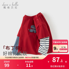 戴维贝拉儿童长袖T恤春装新款男童宝宝纯棉假两件红色上衣打底衫