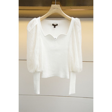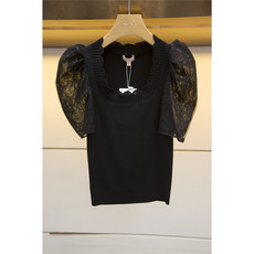 【光年】方领露锁骨波点短袖针织T恤女夏季韩版宽松百搭打底上衣