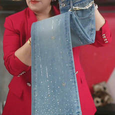 拉夏贝尔欧版微喇牛仔裤女2026年春秋流星烫钻修身显瘦弹力长裤