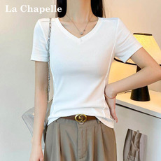 拉夏贝尔白色V领鱼骨正肩短袖t恤女春夏修身设计感打底衫低领上衣