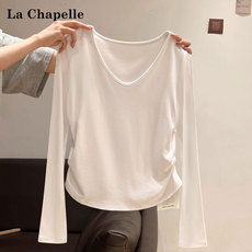 拉夏贝尔/La Chapelle纯色简约抽褶长袖T恤女秋新款修身百搭上衣
