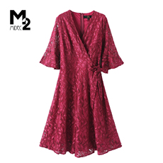 M2奥莱店春秋浪漫氛围感蕾丝连衣裙V领喇叭袖系带收腰中长裙