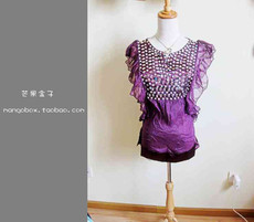 欧美 金属钉 铆钉 高贵紫色亮闪纱质无袖衫 荷叶边 背心