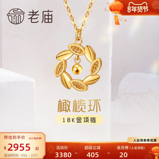 老庙黄金18K金橄榄枝幸运衔草环金珠项链吊坠O字链官方旗舰店正品