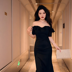 instunning法式气质一字领连衣裙女高级party小礼裙缎面鱼尾长裙