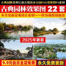 古典园林苏州中式江南古镇滨水公园建筑景观PSD分层效果图PS素材