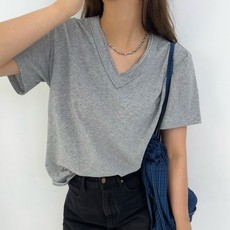 ACRAB 夏日慵懒 新款灰色纯棉V领正肩简约百搭韩版上衣短袖T恤女