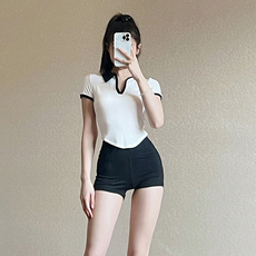 撞色翻领运动短袖女春夏季紧身显瘦瑜伽T恤性感时尚短款健身上衣