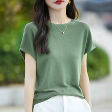 一字领卷边针织短袖女天丝绵T恤夏季薄款宽松打底衫半袖内搭上衣
