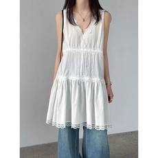 法国法式浪漫蕾丝拼接V领背心裙女26夏季打褶收腰叠穿连衣裙