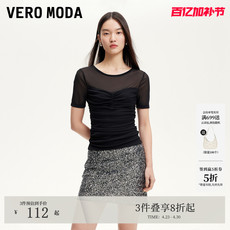 Vero ModaT恤夏季分割线圆领打褶修身短袖网纱拼接上衣