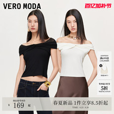 Vero ModaT恤女2026夏季新款一字领立体扭结拼接网纱修身上衣时髦
