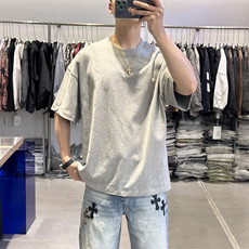 2026夏季潮牌分割拼接烫钻短袖T恤男美式重磅高克重纯棉半袖t上衣